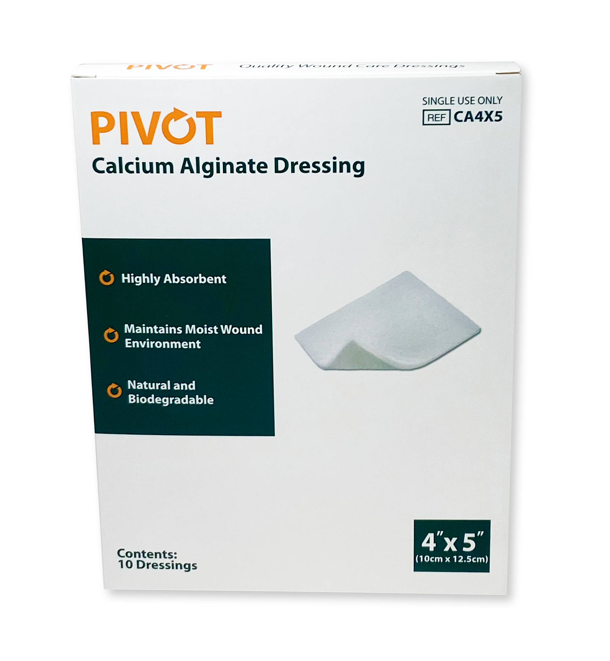 PIVOT Calcium Alginate Dressing is a fibrous highly absorbent, all-natural biodegradable material derived from seaweed, which assists in maintaining a moist environment for optimal wound healing. PIVOT Calcium Alginate Dressing can absorb 20 times its weight in exudates, soak up loose debris from the wound bed, and provide a painless dressing change.